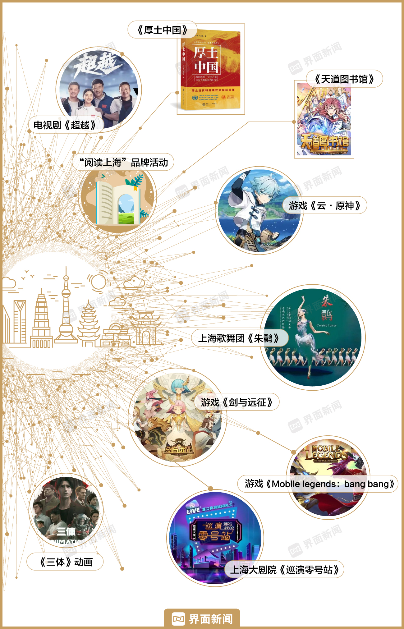 10个文化IP中,既有《厚土中国》这样通过讲述中国脱贫攻坚战,向世界贡献中国经验,传递中国价值的厚重纪实作品,也有“阅读上海”这类展现海派文化内涵,展示上海国际大都市品格和风采的品牌活动,有《云·原神》《Mobile legends:bang bang》《剑与远征》等一批数字时代扬帆出海的原创游戏IP,也有上海大剧院《巡演零号站》、上海歌舞团《朱鹮》等中外演艺文化交流的成果,还有《三体》动画、《天道图书馆》等网络视听和网络文学领域的国际化项目,全面展现了上海文化贸易领域的新发展和新动能。