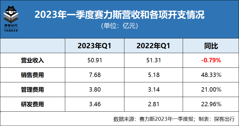 「探客出行」从赛力斯2023年一季度业绩报发现:2023年Q1赛力斯实现营收约50.91亿元,比上年同期还少了0.40亿元。