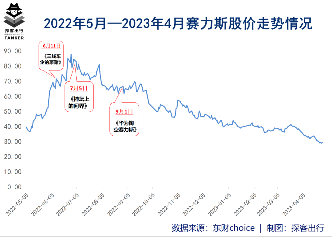 月销量从2022年10月的1.20万台,大幅下滑至2023年4月的2953台,赛力斯仅仅用了半年时间。与此同时,赛力斯的市值较最高峰时已蒸发了近70%。