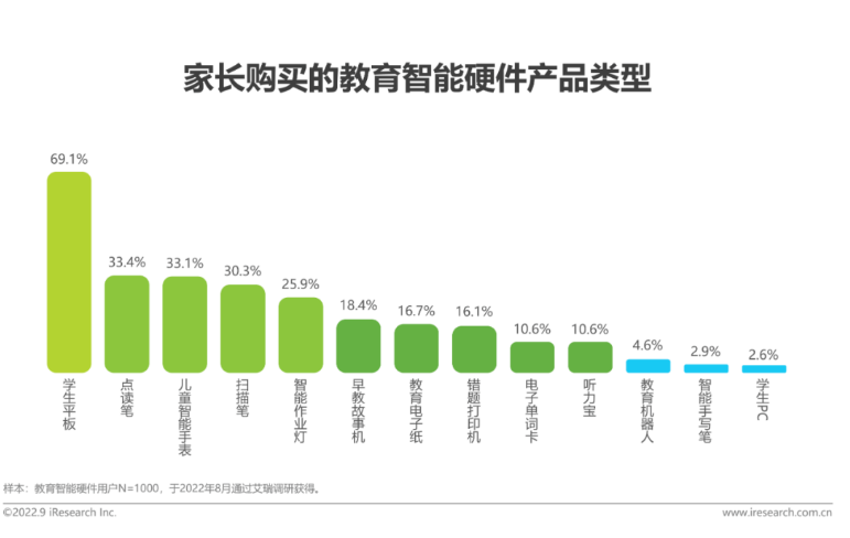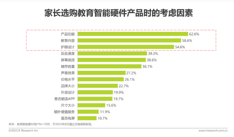 艾瑞调查也显示,家长选购教育智能硬件产品最看重的三个方面就是产品功能、教育内容和护眼设计。