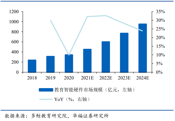 2018-2024E教育智能硬件市场规模及增速 图源:华福证券