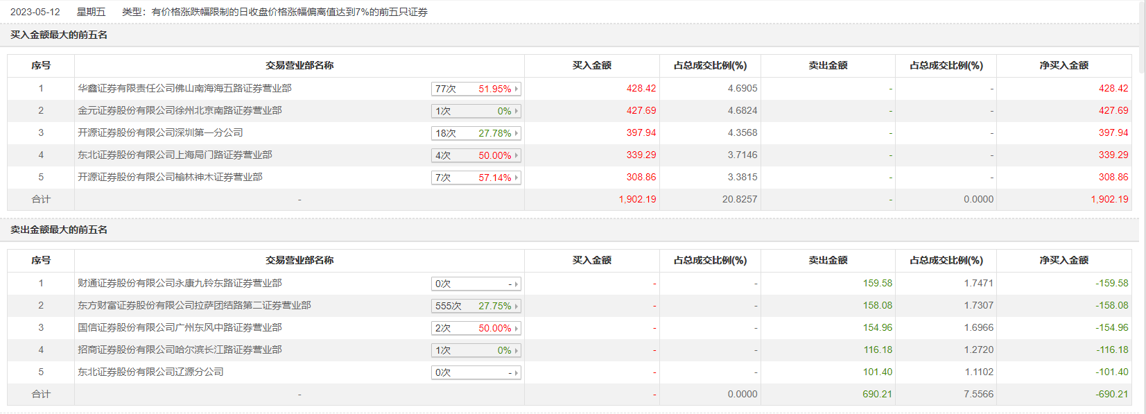 具体来看,华鑫证券佛山南海海五路证券营业部、金元证券徐州北京南路证券营业部分别买入428.42万元、427.69万元;财通证券永康九铃东路证券营业部、东方财富证券拉萨团结路第二证券营业部分别卖出159.58万元、158.08万元。