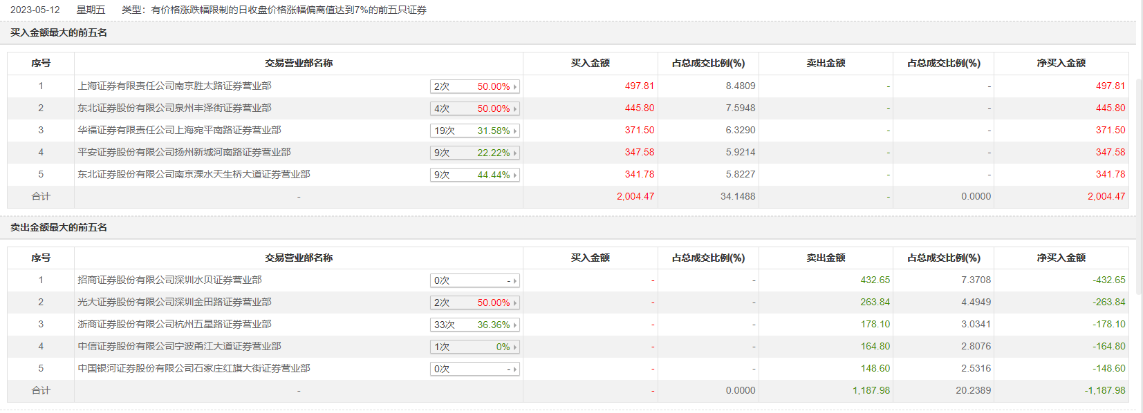 具体来看,上海证券南京胜太路证券营业部、东北证券泉州丰泽街证券营业部分别买入497.81万元、445.80万元;招商证券深圳水贝证券营业部、光大证券深圳金田路证券营业部分别卖出432.65万元、263.84万元。