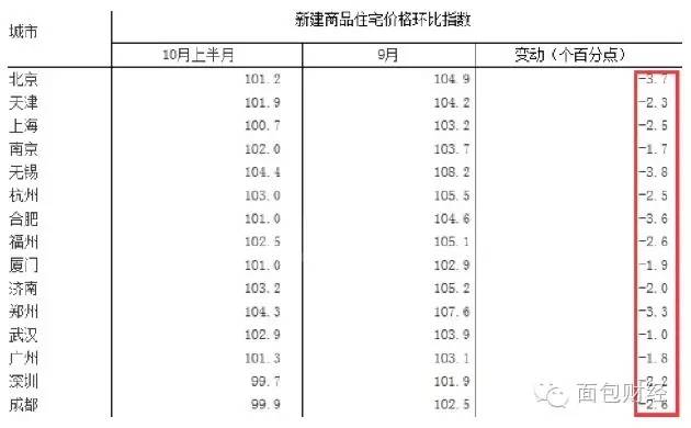 在一系列楼市调控下,一线城市和部分二线城市房价上涨的趋势已经改变,至少统计数字如此。据国家统计局数据,10月上半月,公布的15个城市房价悉数出现环比下跌。其中北京环比下跌3.7个百分点,上海环比下跌2.5个百分点。而在此前,北京、上海、南京、厦门等城市的新房价格同比涨幅都超过30%,深圳9月份房价与去年底相比更是大涨超过51.3%。下图是面包财经对国家统计局公布的新建商品住宅价格指数的截图: