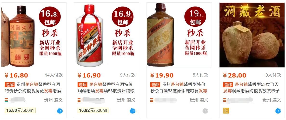 某宝上检索“茅台镇+发霉”即可查到600多个结果,最便宜的仅16.8元/瓶