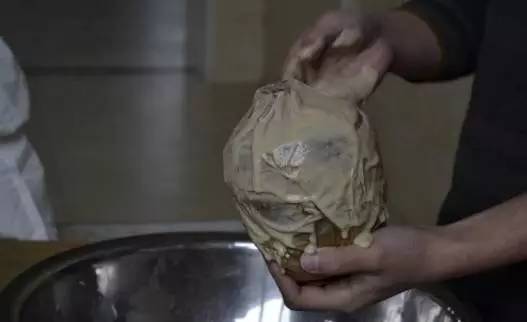 (3)把之前调制好的混合物均匀的涂抹在包好皮纸的酒坛表面