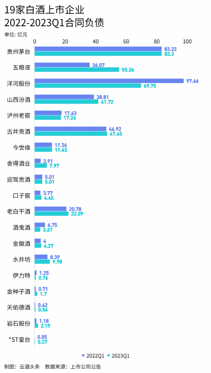 此外,舍得酒业一季度末的合同负债也较去年同比增长了103.84%,环比增长了167.45%;老白干酒一季度末合同负债同比增长6.03%,环比增长48.16%。老白干酒表示,合同负债的增长主要系预收货款增加所致。