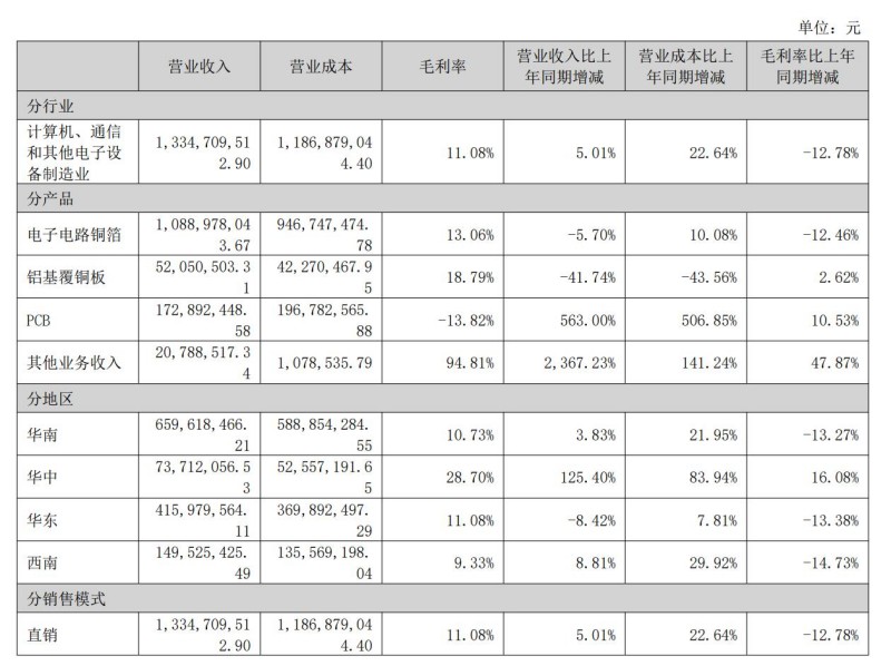 就在收入下降的同时,电子电路铜箔的毛利率为13.06%,和上年相比,减少了12.46个百分点,毛利率几乎“砍半”。