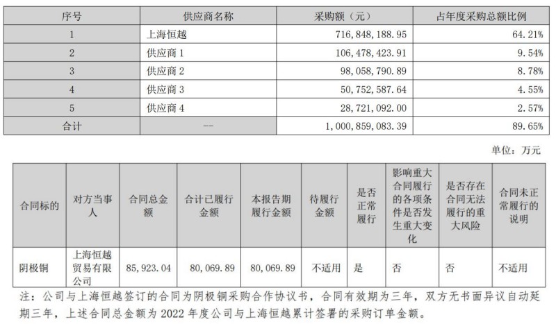 其中,逸豪新材2022年向上海恒越贸易有限公司(以下简称“上海恒越”)采购金额达7.17亿元,占年度采购总额的比例为64.21%,主要采购商品为阴极铜。仅第一大供应商的采购额就超六成;而且上海恒越是贸易商,并非最初生产商,采购价格是否具有优势?年报并未详细说明。