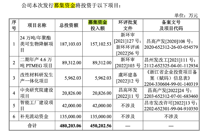 招股书显示,蓝山屯河此次IPO共募集资金45.02亿元,其中,15.71亿元用来投资24万吨/年聚酯类可生物降解项目,8.9亿元用于二期年产4.6万吨PEMEG项目,13.5亿元用于补充流动资金,剩余资金用于厂房及配套设施建设。