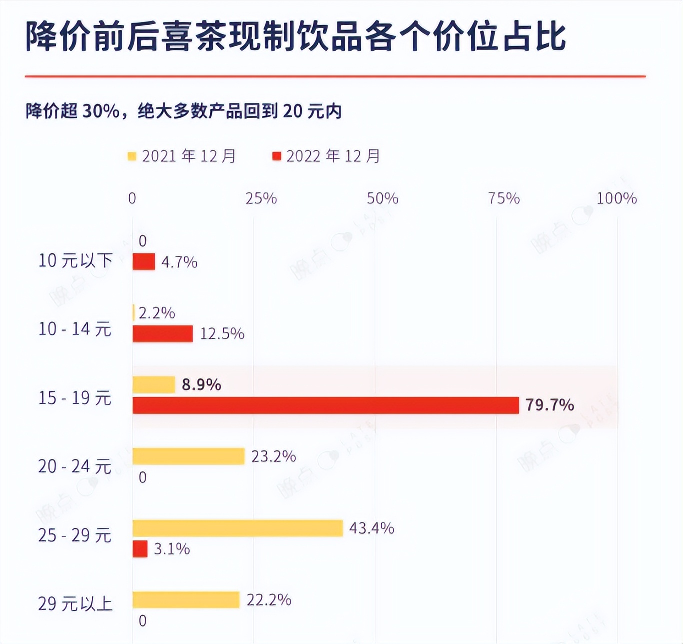 但如今,茶饮企业正放弃过去的高定价转而追求低成本。2022年初,喜茶率先打响了价格战,全面调价开始下沉。据晚点数据,调价后的喜茶,超96%的饮品定价在20元以内。奈雪也推出了价格在9—21元的茶饮。