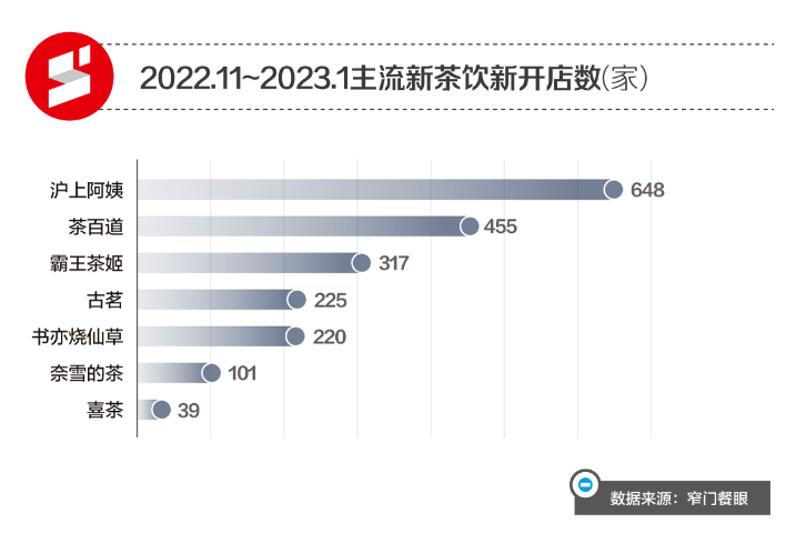 根据窄门餐饮数据,从2022年11月到今年1月,除喜茶外的头部茶饮品牌新开门店数量均超百家,沪上阿姨甚至高达648家。进入2023年后,部分茶饮品牌更是迎来一轮史上最大规模扩张。