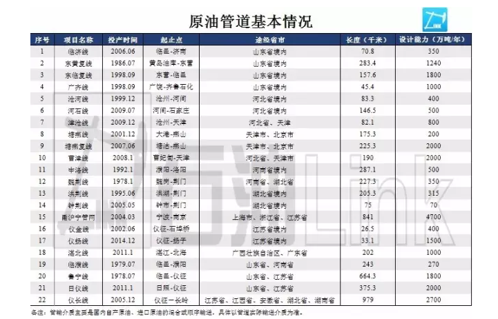 经统计,此次中石化公开的原油管道总长达到5618.6公里,设计管输能力为2.59亿吨/年,其中最长的原油管道为“仪长线”(仪征-长岭)投产于2005年12月,长度为979公里;最短的为“仪金线”(仪征-石阜桥),仅为26.5公里。