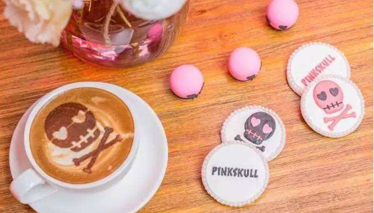 活动期间,顾客可以去喝杯有着骷髅拉花的咖啡,咬上一口有着骷髅图案的翻糖饼干,也可以在镜子前试试新产品,从眼线笔、眼影盒到唇彩、唇膏一应俱全。