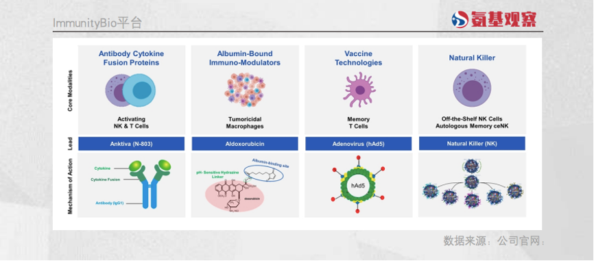 如下图所示,ImmunityBio就具有诸多技术平台,共同作用于整个免疫反应。基于这些平台,能够研发诸多具备竞争力的管线。