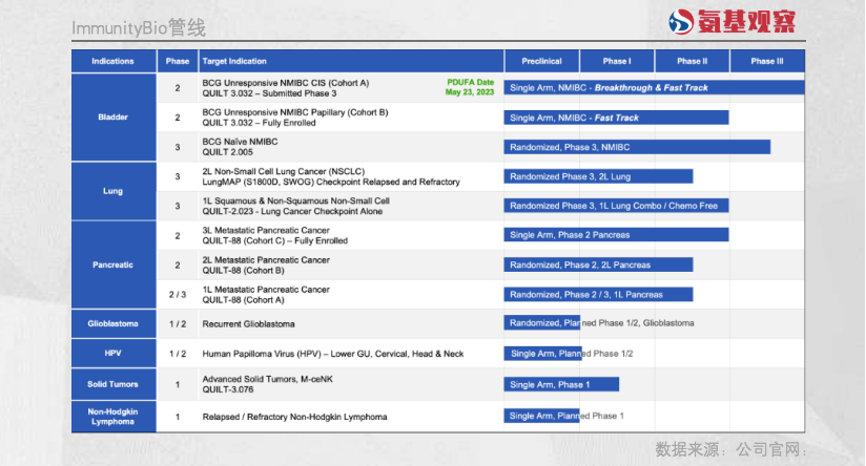 在治疗管线方面,ImmunityBio表示,目前拥有26项临床实验正在进行之中,其中17项处于2 期或3期开发阶段。众多的管线,也覆盖了诸多不治之症,包括膀胱癌、胰腺癌和肺癌。
