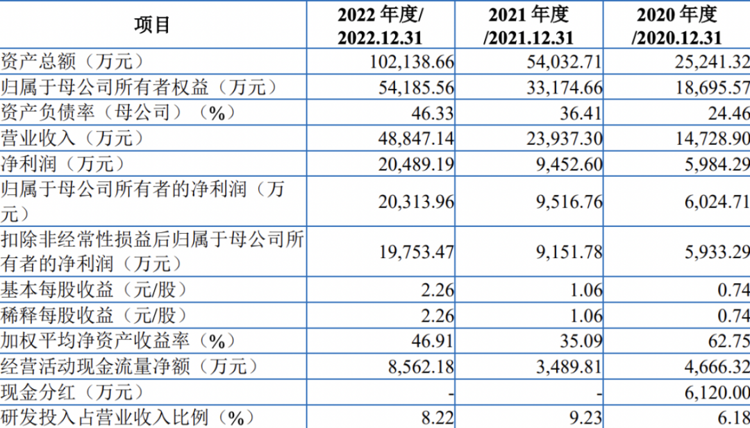 透过曼恩斯特也可以一窥中国动力电池爆发景象。财报显示,2020-2022年,公司的营收分别为1.47亿元、2.39亿元和4.88亿元,净利分别为6024万元、9516万元和2.03亿元,收入逐年增长。