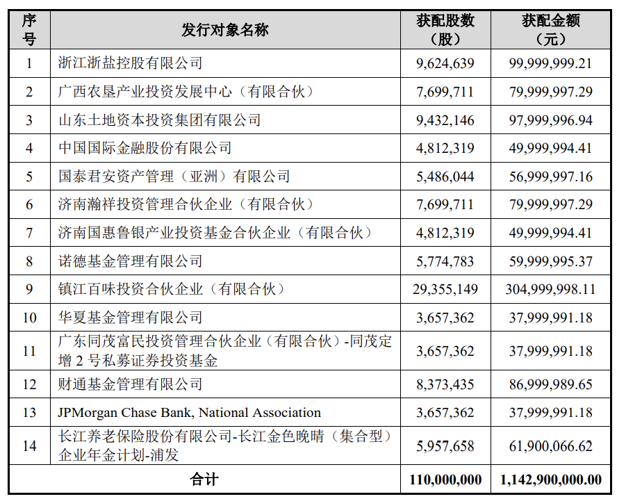 恒顺醋业5月15日发布2021年度向特定对象发行A股股票发行情况报告书,本次发行的募集资金总额为11.43亿元,扣除各项发行费用2146.25万元(不含增值税)后,实际募集资金净额为11.21亿元,本次发行的发行数量最终为1.1亿股,本次发行对象最终确定为14名,镇江百味投资合伙企业、浙江浙盐控股有限公司、中国国际金融股份有限公司等获配。