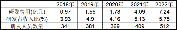 从研发角度来看,公司在研发方面的投入还是舍得的。2021年,公司研发支出4.09亿,2022年公司研发支出7.24亿,同比增长77%,研发人员数量也在稳定增加,同时研发支出占总营收的占比也在升高。