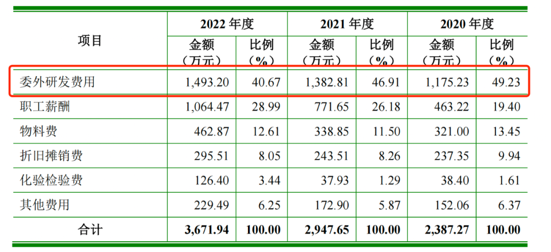 委外研发主要是指公司委托第三方CRO(医药研发合同外包服务机构)企业进行研发。报告期内,知原药业的委外研发费用分别为1175.23万元、1382.81万元和1493.20万元,占当期研发费用总额的比例分别为49.23%、46.91%和40.67%。