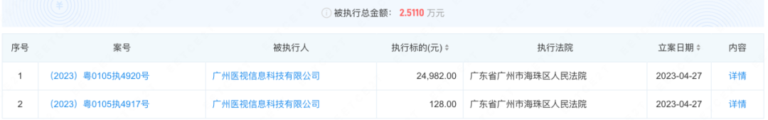 然而企查查显示,广州医视成立于2020年7月,且2023年4月被列为被执行人,被执行总金额为2.511万元。