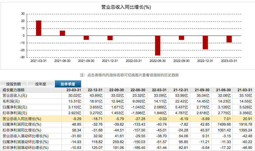 2023年第一季度的营收负增长,已经是森马股份连续第7个季度出现营收同比下滑了。