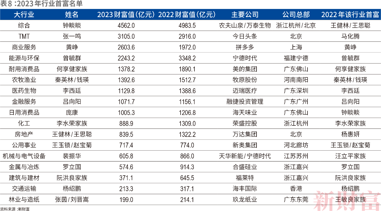 此外,杨惠妍家族曾于2007、2008年蝉联全国首富,并有8年跻身全国前十富人,2023年财富下降为562亿元,憾别地产业首富,王健林、王思聪父子则以840亿元身家登上行业首席。2022年11月后,“央行十六条”、支持房企发债融资、房企股权融资重启等三箭齐发,政策明显转向,地产业的创富格局会如何演变,值得关注。
