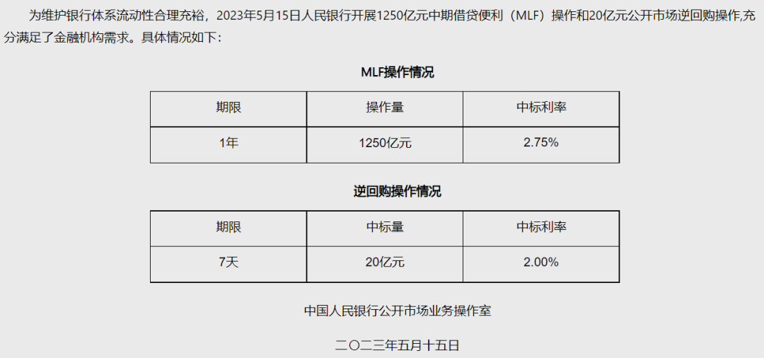 没有“降息”。5月15日,央行公告称,为维护银行体系流动性合理充裕,2023年5月15日人民银行开展1250亿元中期借贷便利(MLF)操作和20亿元公开市场逆回购操作,充分满足了金融机构需求。这在一定程度上,或许会缓解助贷营收端的压力。
