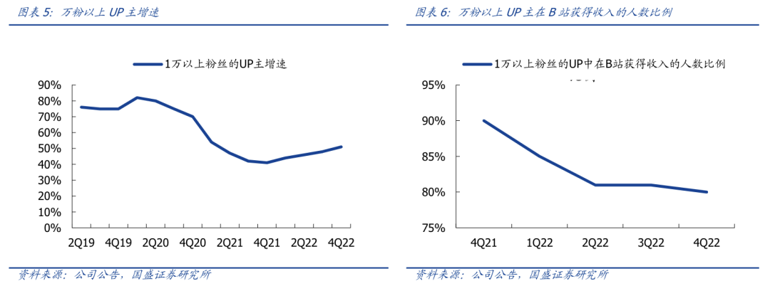 表现在财报里,就是月活跃UP主中获得收入的占比从2021年的42.7%下滑至34.2%,获得收入的万粉UP主比例从90%下落至80%。