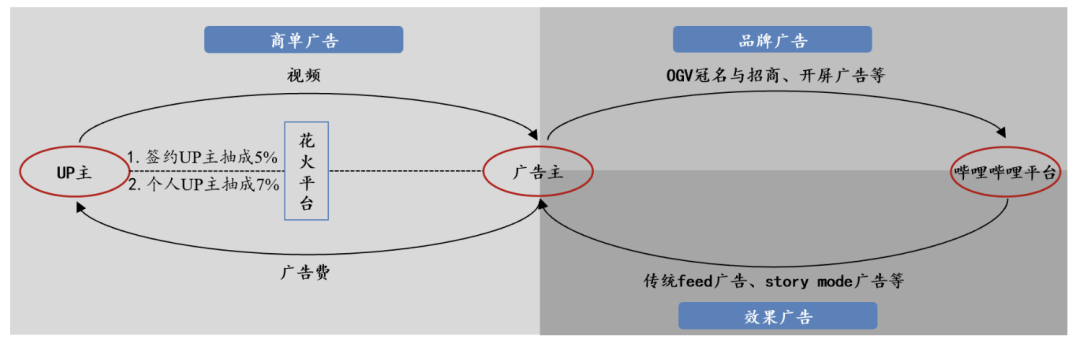 B站的广告商单主要通过花火平台完成,UP主入驻、广告主挑选,花火作为撮合平台抽成。