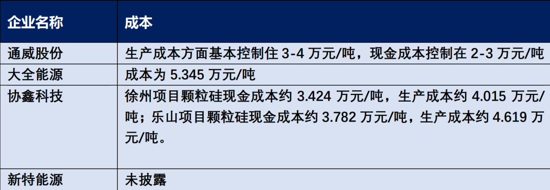 通威股份成本控制最佳。在生产成本方面基本控制住3-4万元/吨,现金成本控制在2-3万元/吨(剔除工业硅市场价格因素影响,以不变价计算)。