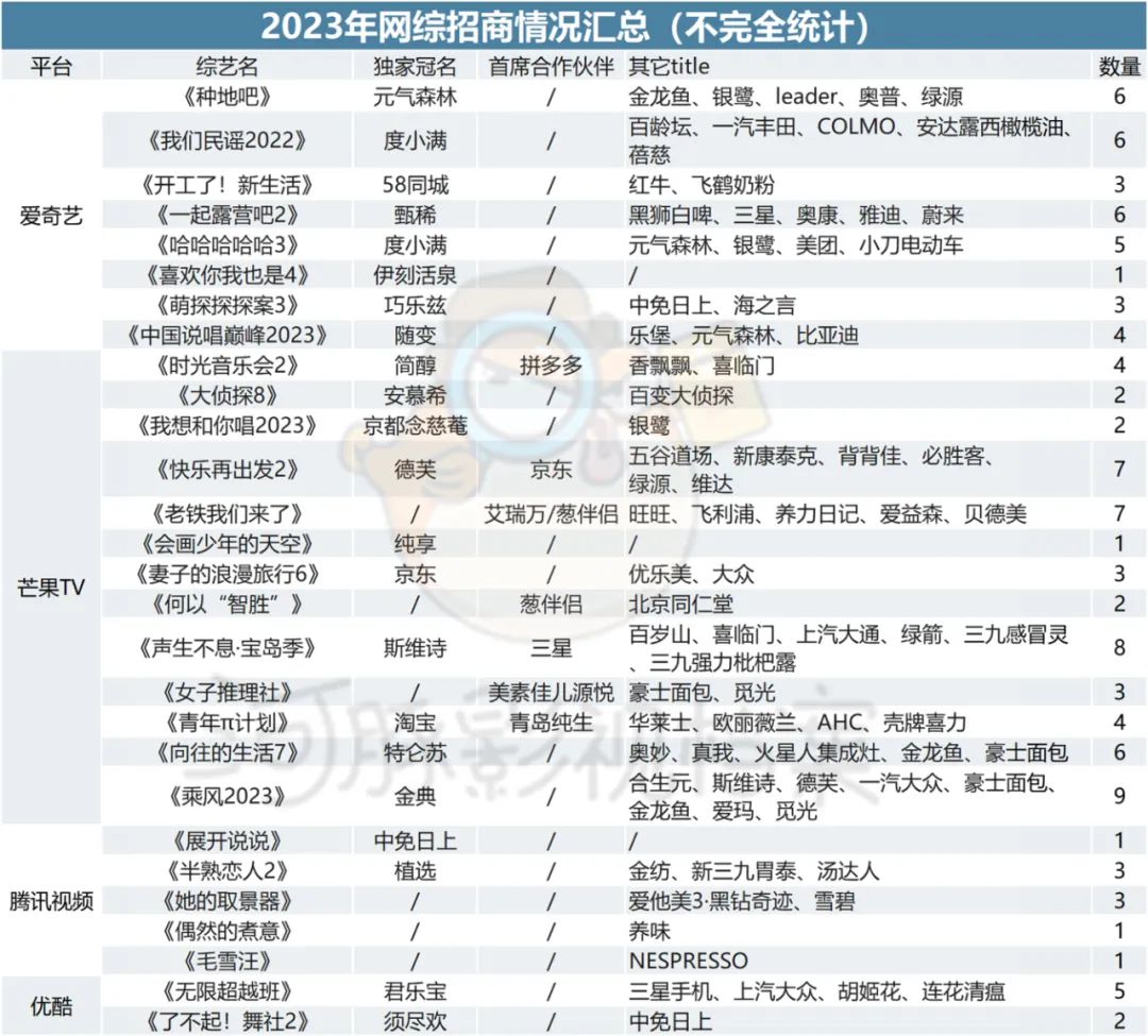 在这背后,更值得关心的还有真正决定综艺命运的问题:招商。乍看之下,综艺招商的难题在得到解决,起码没有再出现裸播的情况,但这也反映出平台不再像去年那样敢于承压。