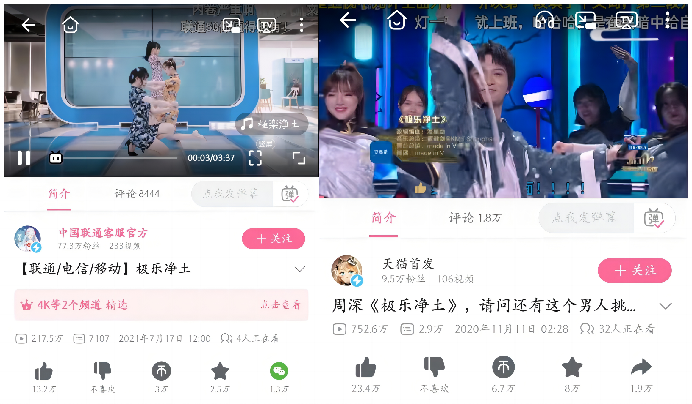 移动、联通、电信三大运营商官号都发过制服小姐姐跳《极乐净土》的视频;“中科大研究生招生”发过同学们在校门口跳《极乐净土》;