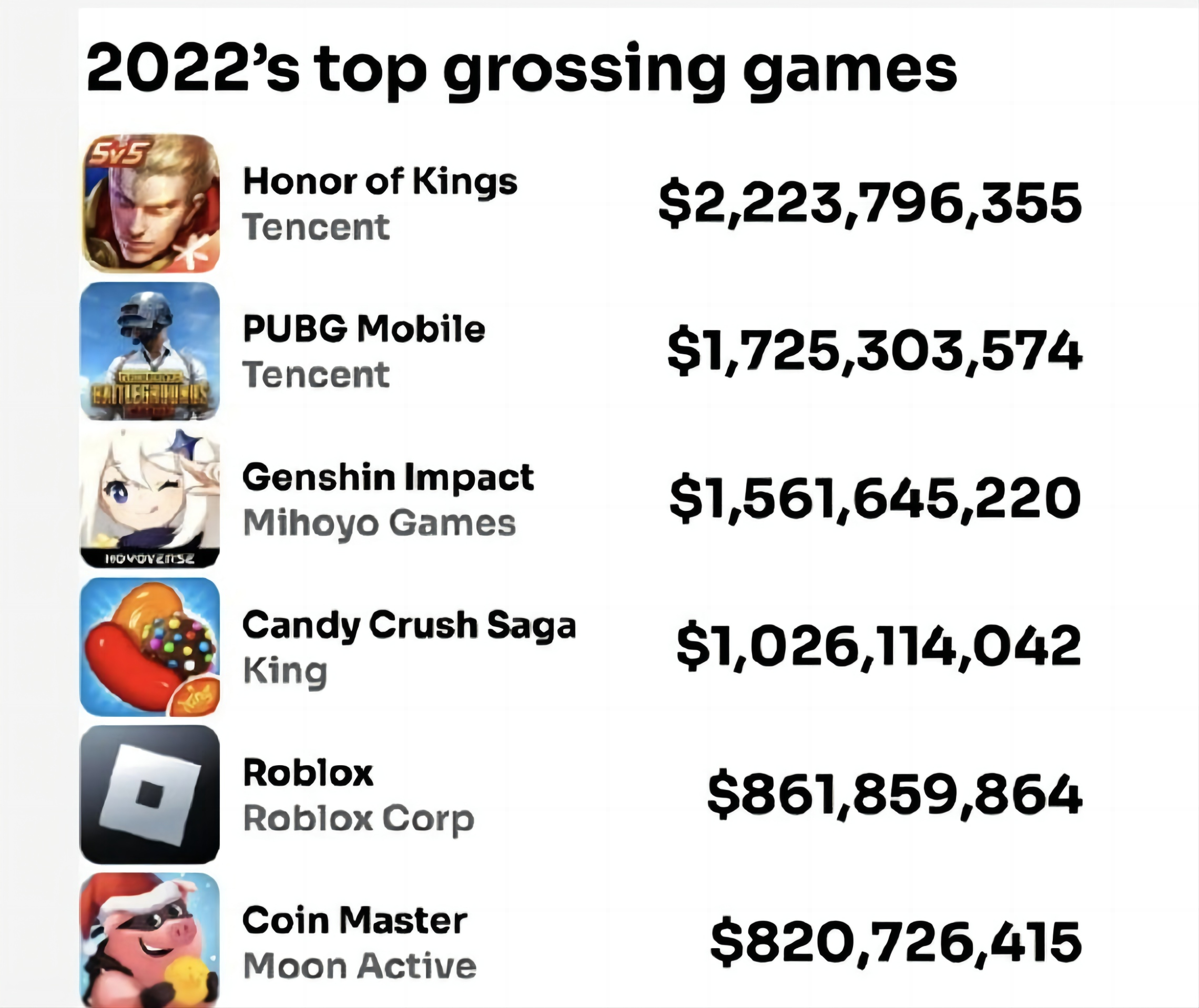 同一年,腾讯的《王者荣耀》全球营收22.23亿美元,腾讯的《PUBG》(绝地求生)17.25亿美元,米哈游的《原神》15.61亿美元,三个游戏合计营收55.09亿美元,约合374亿人民币。
