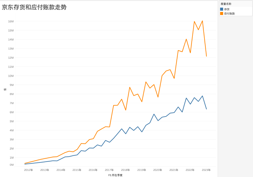 在上图中我们可以看到,京东的存货和应付账款都呈剧烈下行势头,这其实也是一个转型中的企业所必须要面对的挑战。