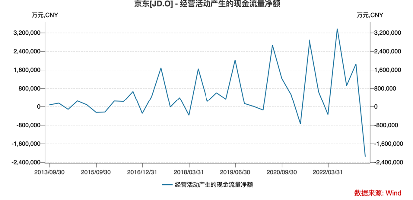 上图为京东经营性现金流的走势情况,很明显在2023年Q1该指标流出规模也创了历史新高。原因也比较简单,当自营业务增速变缓之后,企业的积蓄现金的能力也是要随之下降的。