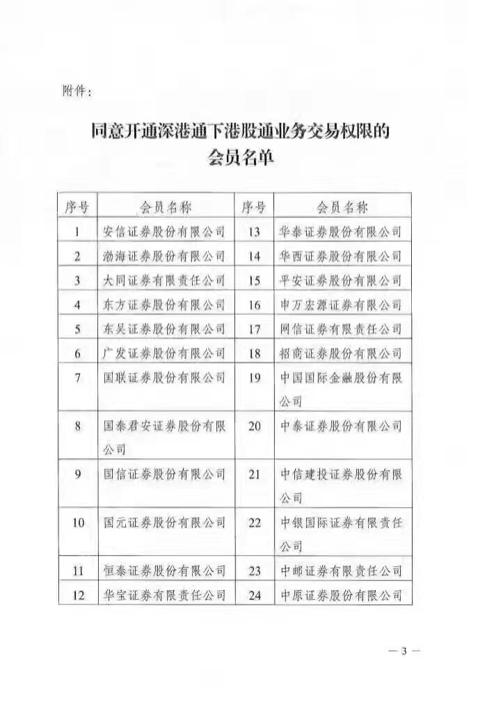 文件中还提到港股通业务交易权限,是深交所“经各家会员单位”申请后同意。对于为何率先开通24家券商的业务,该负责人表示,24家券商只是先期试点,以后会逐步放开。至于业务开通的先后顺序可能和业务申请时间,及申报材料质量有关。“我们是10月后申请的,不到半个月”。也不排除有大券商在控制节奏,暂缓申请。