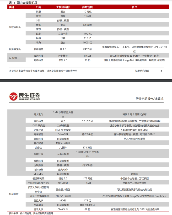 民生证券研报显示,目前中国已有 30 多家企业布局大模型。入局的企业主要包含互联网巨头、服务器龙头、AI 公司以及科研院所四大类,其中以互联网和 AI 公司居多。