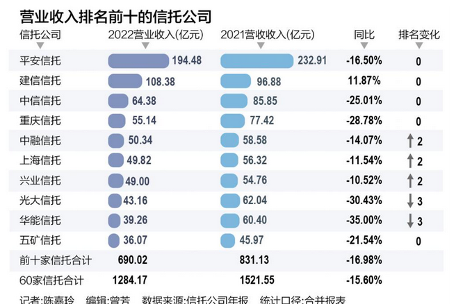 截至目前,60家信托公司已渐次披露2022年“成绩单”。据21世纪经济报道记者统计,合并口径下,60家信托公司累计总计实现营业收入1284.17亿元,净利润416.19亿元。相较于2021年的财务数据,同比分别下降15.6%和22.2%。