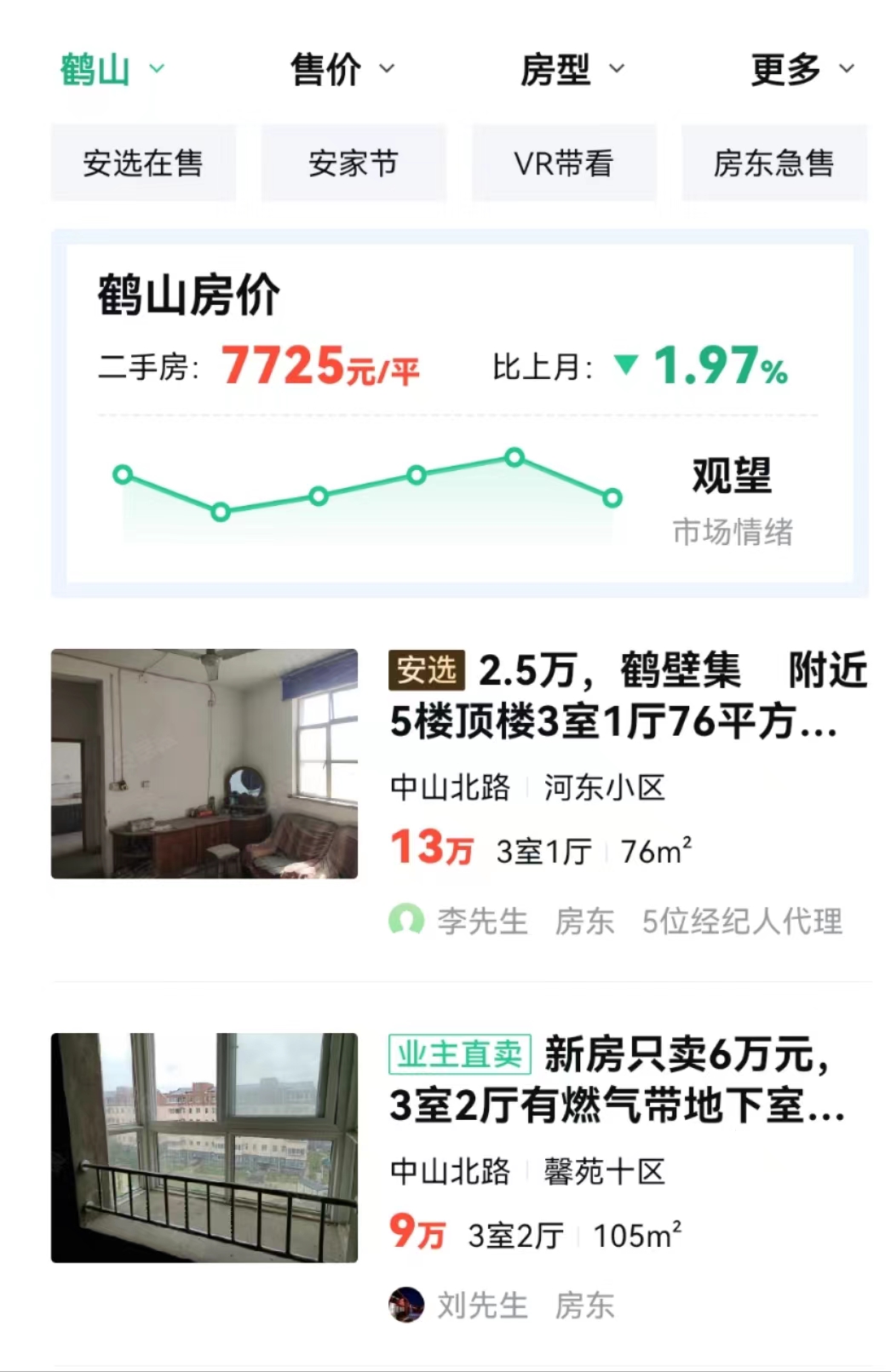 王雨告诉时代周报记者,鹤山区二手房源不少,总价多在1万到5万元之间,但因为没有市场,很少会挂在线上看房平台,“一般是线下或者短视频平台找客源了”。