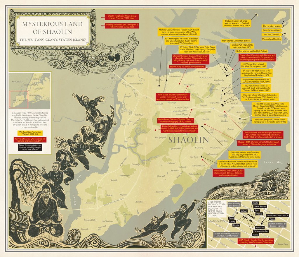 对于中国读者而言,其中最有趣的一张地图莫过于与曼哈顿一河之隔的斯塔恩岛,那里有优美的自然风光和多元的种族构成,来自斯里兰卡、利比亚、俄罗斯和中国的新移民陆续加入了原本以爱尔兰裔和意大利裔为主的人口。但是无论你来自哪里,都无法否认,斯塔恩岛上的嘻哈天团是武当派的功夫传人,在这张地图上,我们可以看到华人开设的武馆、超市、美甲店和中文学校,及其背后的移民历史和文化融合的故事。