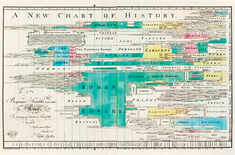 在最简单直接的一条直线的基础上,又演化出了很多利用制图技术将时间——或者说将历史年表——可视化的尝试,例如书中提到的,18世纪的英国神学家约瑟夫·普利斯特里绘制的“新历史图表”,这是一种用图形而非文字记述历史的方法,从这一意义上,我们也可以将它视为时间的地图。