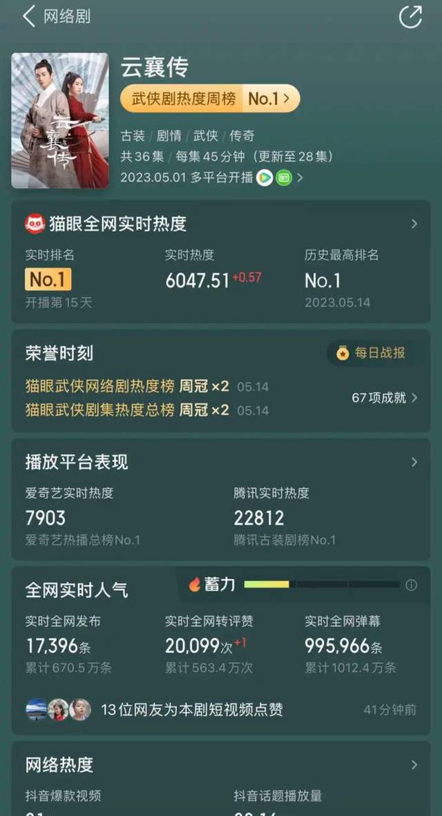 譬如,古装剧《云襄传》在5月15日下午的爱奇艺的热度值为7903,位列爱奇艺热播总榜第一;在腾讯视频的热度值却高达2.28万,而且还仅位列腾讯古装剧榜第一。