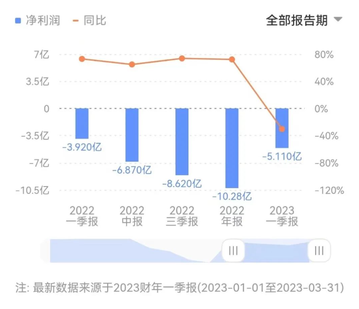 2023年第一季度,Robinhood的营业收入为4.41亿美元,同比增长47%,环比增长16%;净利润为-5.11亿美元,而去年同期为-3.92亿美元,已连续第七个季度亏损。