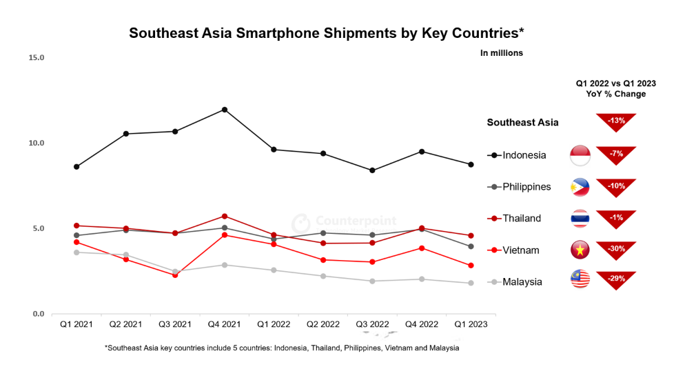 几个主要的新兴市场中,东南亚表现最令人失望。报告显示,今年一季度东南亚五国(印尼、泰国、菲律宾、越南、马来西亚)智能手机出货量同比分别下降7%、1%、10%、30%和29%,整个地区总出货量则同比下滑13%。