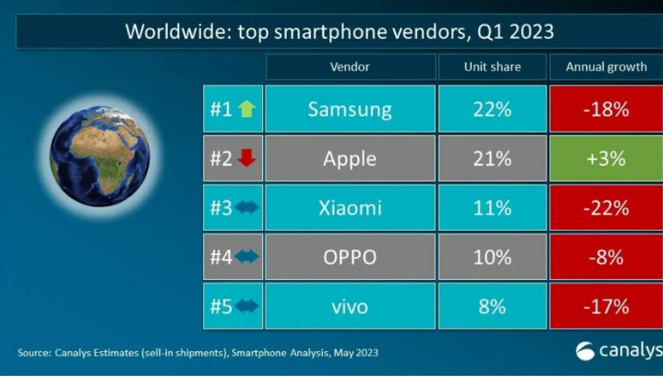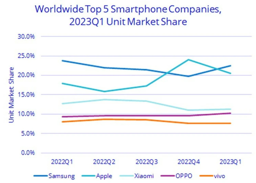 其他几个头部厂商中,苹果占有率为21%,以1%的劣势丢掉冠军宝座,但好在出货量保持3%的同比增长,也是前五名中唯一实现正增长的。排名全球三至五位的小米、OPPO和vivo,出货量同比分别下跌22%、8%和17%。