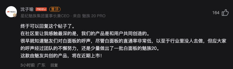 5月17日,星纪魅族集团董事长兼CEO沈子瑜在魅族社区宣布,魅族20系列手机白色面板版本将于近期小批量上市。沈子瑜表示,“应大家的呼声经过团队的不懈努力,还是少量做出了一批白面板的魅族20。这款由魅友共创的产品,将在近期上市!”