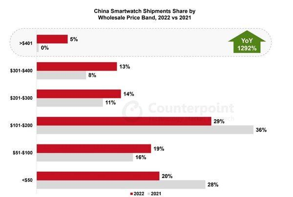 和智能手机一样,受消费者信心下降、全球宏观经济低迷等大环境影响,智能手表出货量也在同比下滑,竞争集中于高端市场——在2022年,401美元(约合人民币2800元)以上细分市场出货量同比增长高达1292%,成为市场最大亮点。