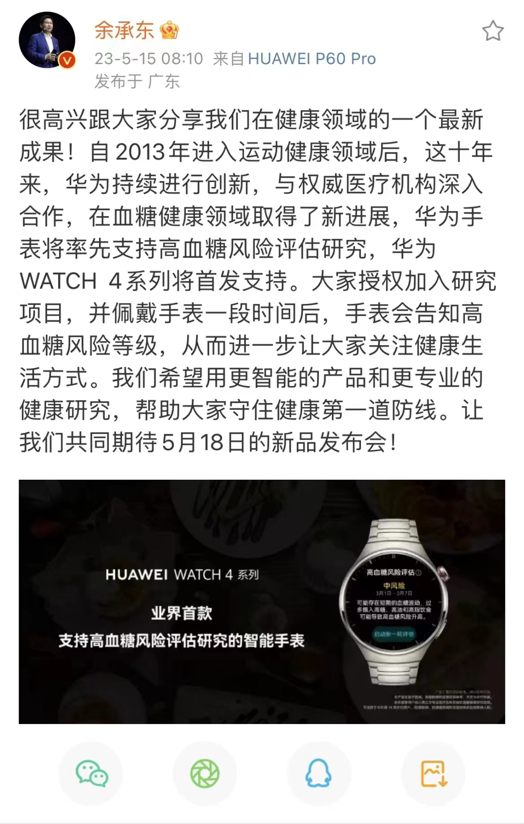 “华为将带来业界首款支持高血糖风险评估研究的智能手表。”近日,华为常务董事、终端BG CEO、智能汽车解决方案BU CEO余承东在微博宣布。