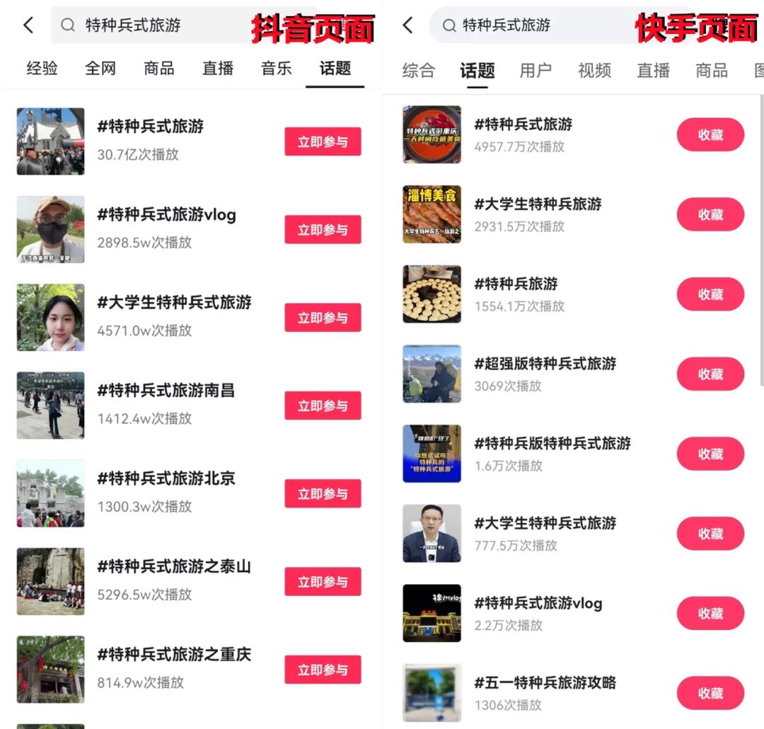 而作为另一热点,#特种兵式旅游 在抖音的话题阅读量达30.8亿,而同类话题在快手上阅读量最高的也仅有4957万。不能排除受众画像对事件传播的影响,但客观上确实会挤压快手的话题传播空间。